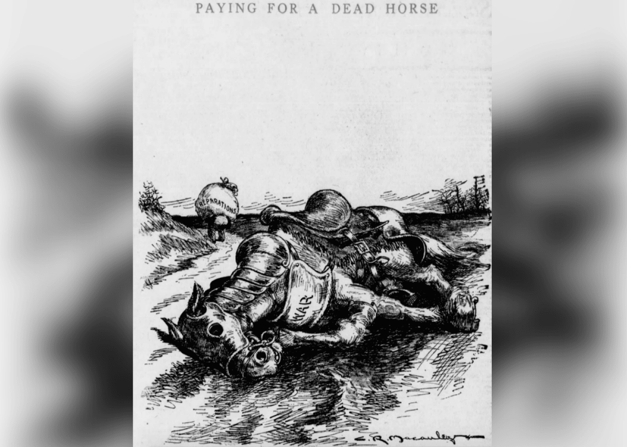 Charles R. Macauley’s 1930 commentary on reparations following World War I won the Pulitzer Prize for editorial cartooning. The powerful imagery depicts the consequences of war in the image of a dead horse, while provisions and reparations are carried by one man in the background. While the Treaty of Versailles, which stipulated such reparations, was signed in 1919, hyperinflation and defaulted payments left Allied relations with Germany fraught. The Young Plan, written in August 1929, effectively reduced the reparations owed by Germany by 17% but was quickly thrown into flux by the onset of the Great Depression.
