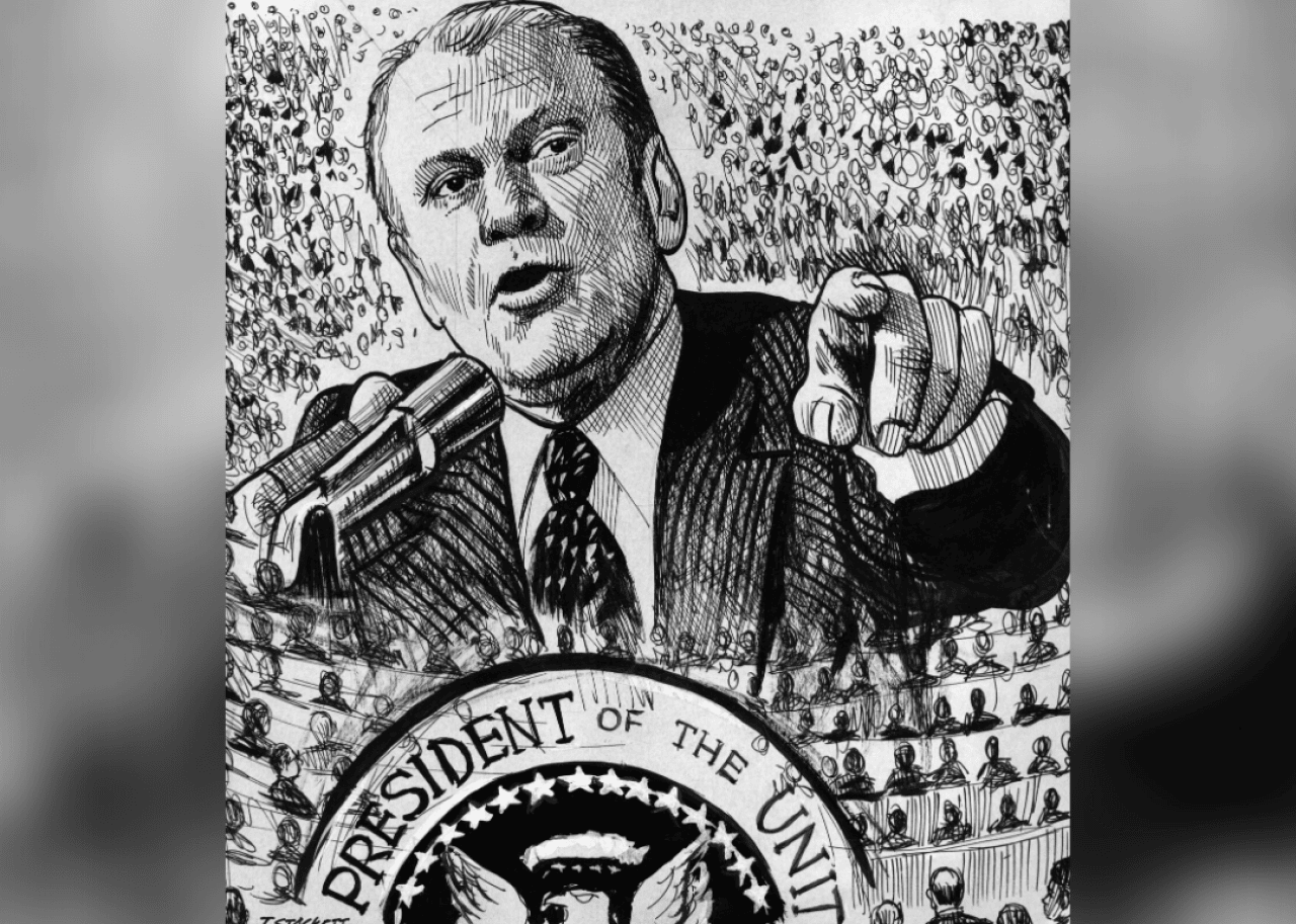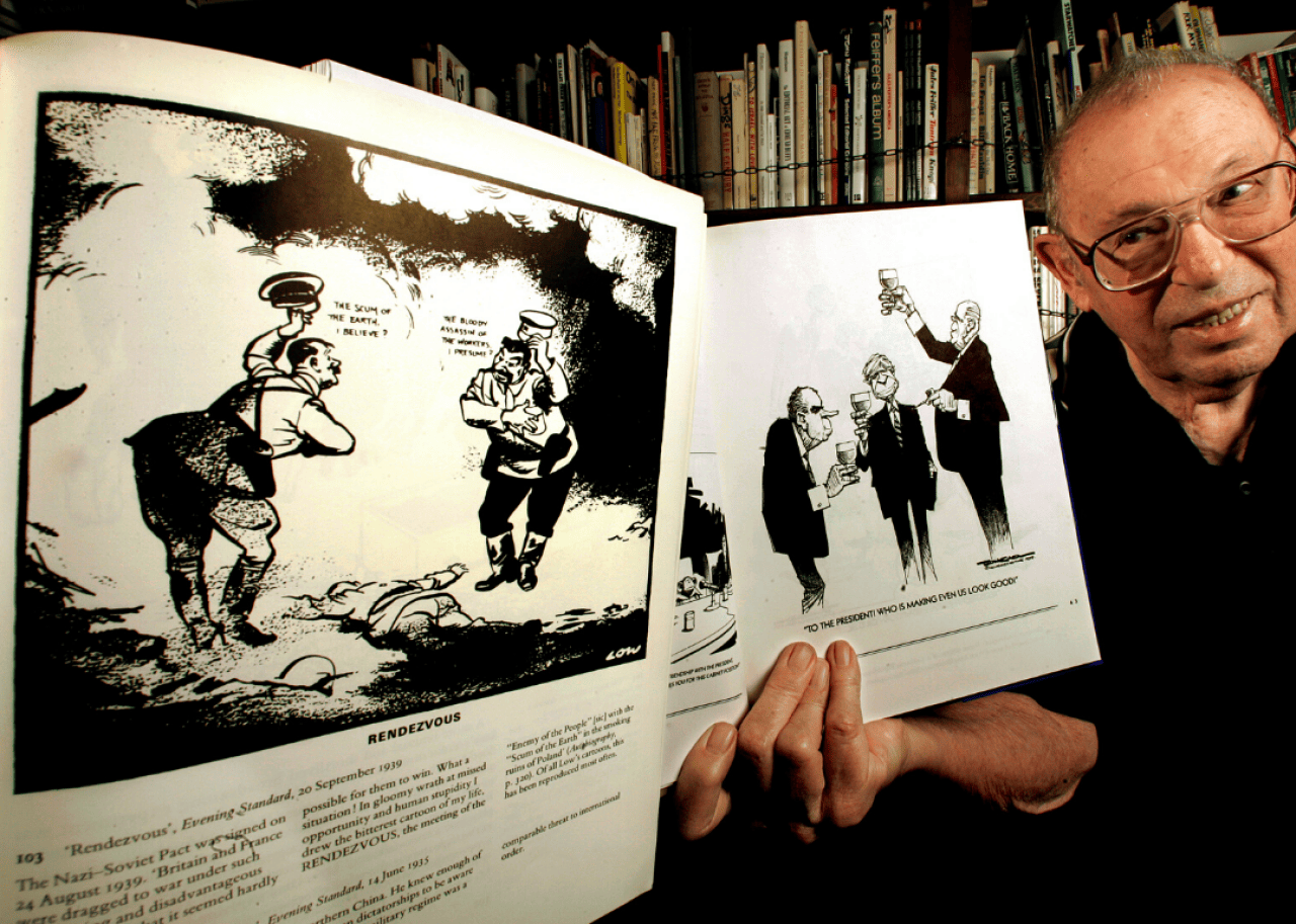 This is a photo of political cartoonist Bob Scheibel. On the left is a cartoon of Stalin and Hitler greeting each other, drawn by David Lowe in 1939. On the right, a cartoon from 1988 where artist Paul Conrad drew Gerald Ford, Richard Nixon, and Jimmy Carter drinking together.