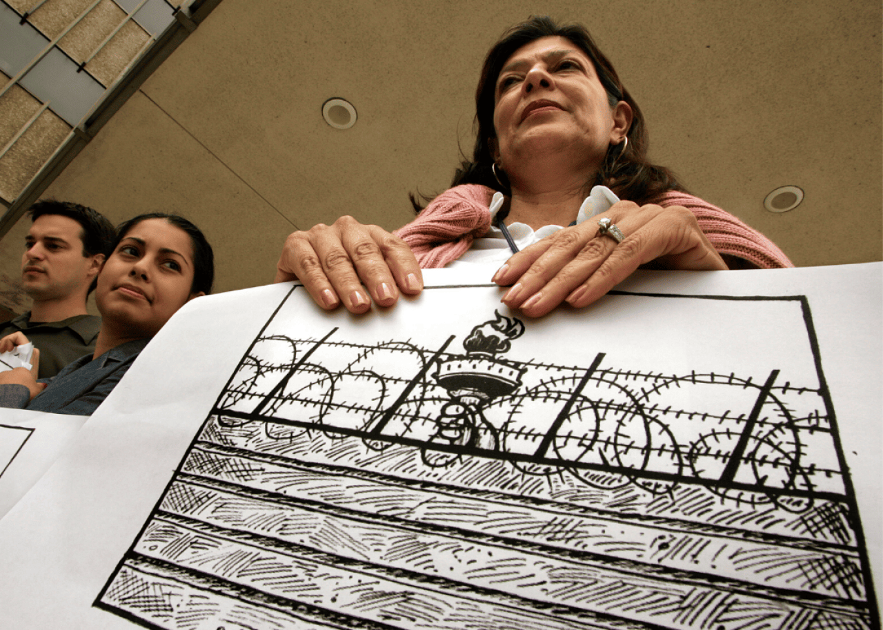 This photo shows a cartoon depicting the Statue of Liberty’s torch trapped in barbed wire. This referred to the state of U.S. immigration law. Salvadoran Amalia Molin, who was detained in 1998 for overstaying her visa, can be seen holding the cartoon.