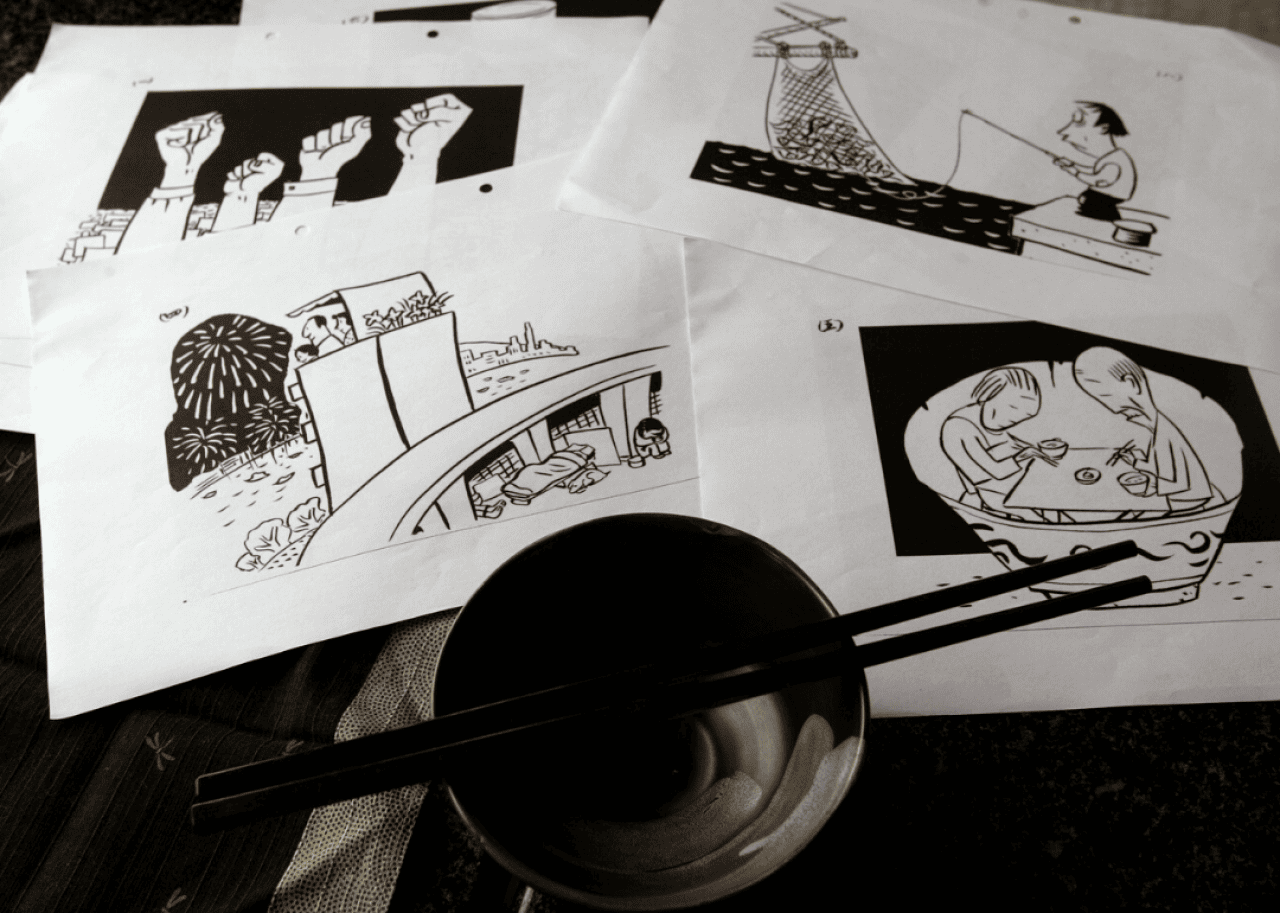 Stacker found this picture of four cartoons, all drawn by Hong Kong cartoonist Zunzi, depicting the hardships art galleries face in collecting funding. One of the cartoons shows a man trying to fish, but all the fish have been caught in one net.