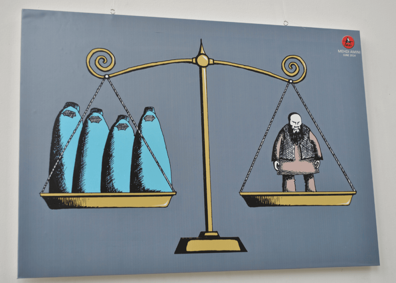 This image shows a balancing scale with a bearded man on one side and four women dressed in Islamic garments on the other. The scale is balanced in equilibrium to show that in certain conservative religious societies, such as Afghanistan, one man is considered to be worth the same as four women.
