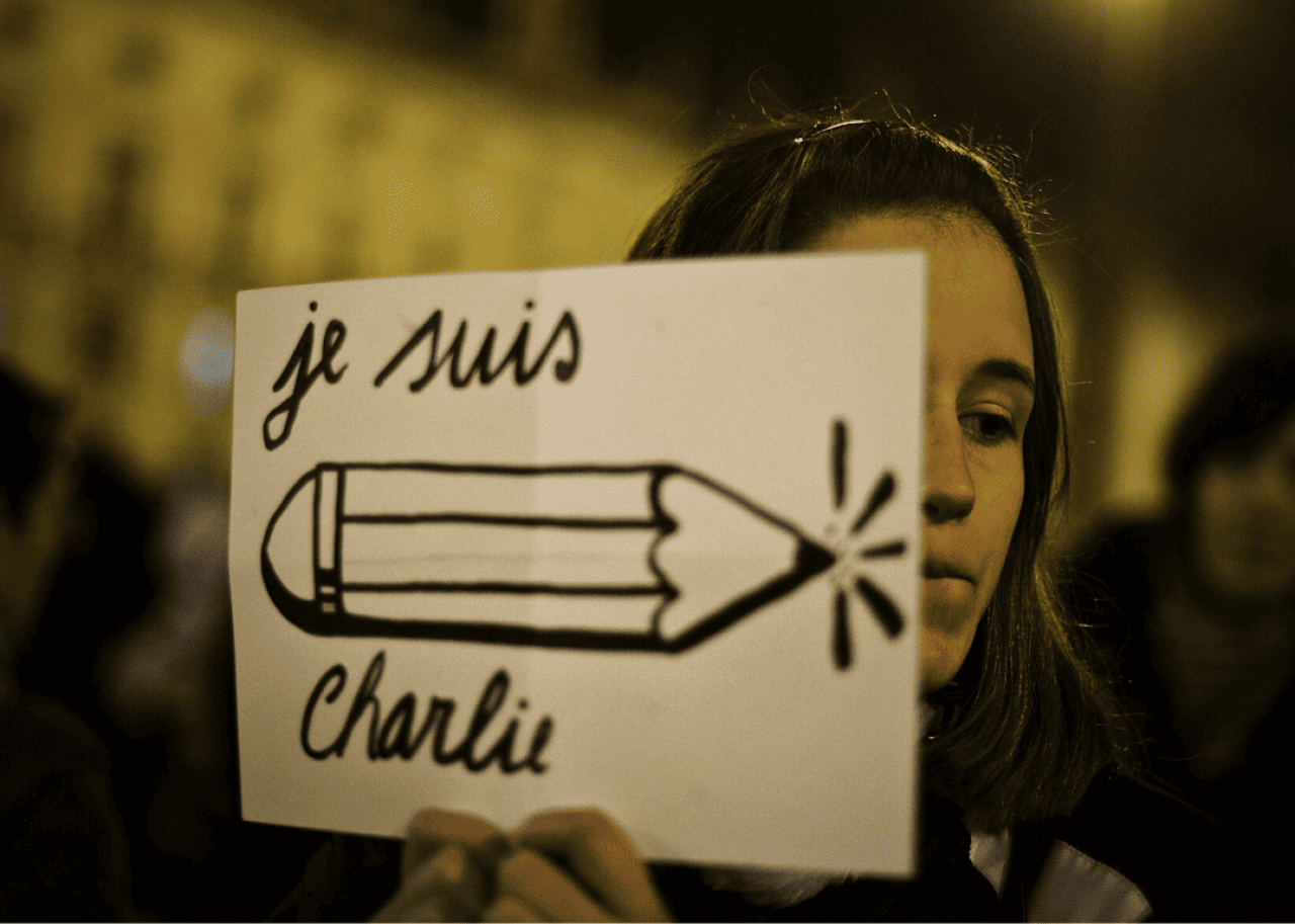 A woman holds a picture of a pencil above the text “Je Suis Charlie” as part of a protest in the wake of the Charlie Hebdo terror attack. The demonstration came in the midst of public outcry following the deaths of 12 staff members at the office of the controversial French political magazine.