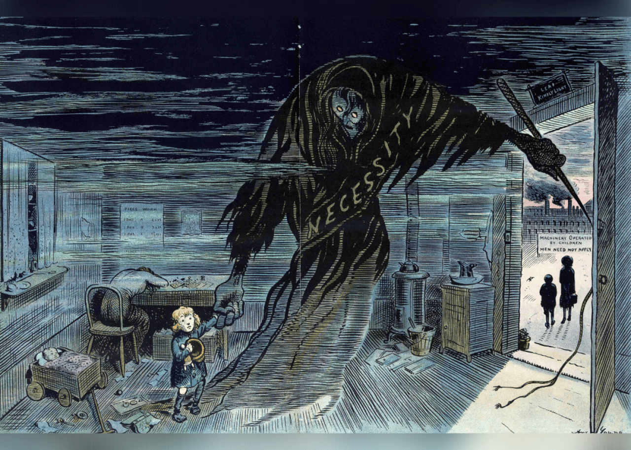 “Next From Cradle to the Mill” is a brutal portrayal of child labor early in the 20th century. A monsterous figure with “Necessity” written on it takes a child menacingly by the hand. In the background, a man’s head is down on a desk, while two children walk toward a factory that says “Machinery Operated by Children.” The cartoon brings to mind the public hearing of Camilla Teoli, who worked as a child at a wool factory and experienced a disfiguring accident.