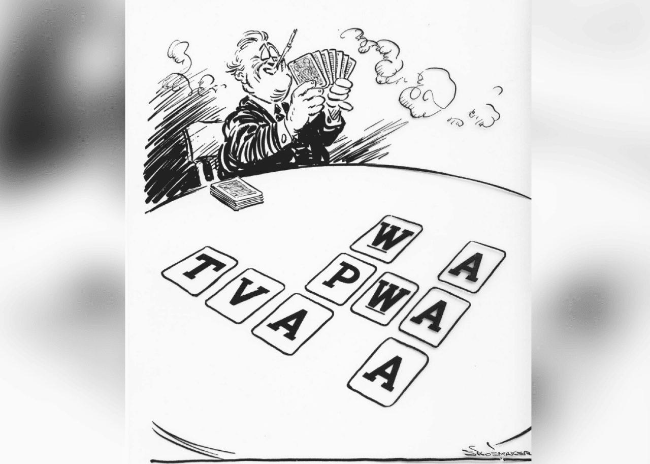 President Franklin D. Roosevelt created “alphabet agencies,” which were part of his signature set of policies to provide relief during the Great Depression. This cartoon mocked his New Deal, likening it to a set of cards that teach children the alphabet. People at the time said the programs were reminiscent of “alphabet soup.”