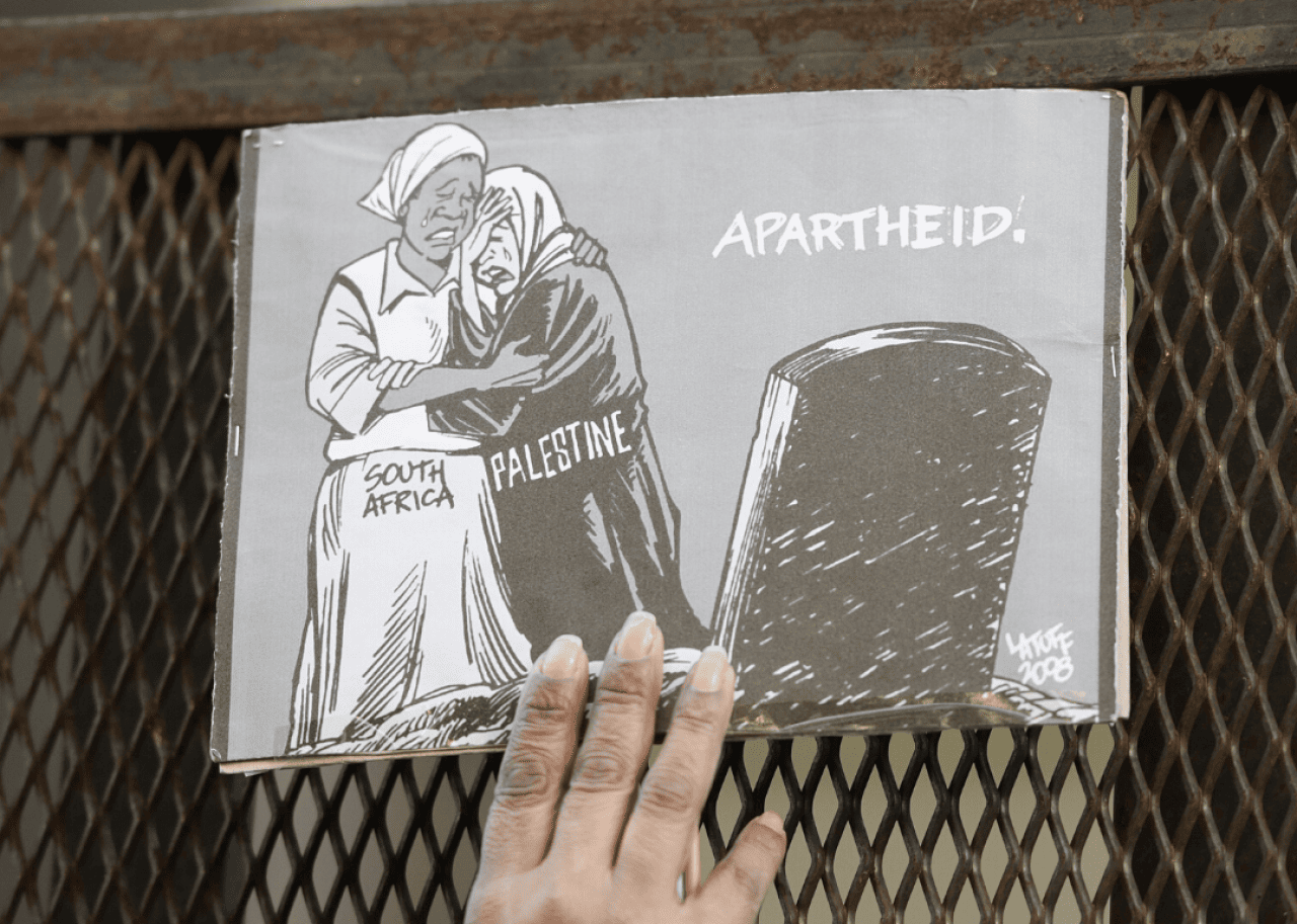 A woman holds up a cartoon of a woman crying in this photo, representing Palestine, while one representing South Africa consoles her. This refers to Israel’s policies on the Palestinian territories. The cartoon, titled “Apartheid,” was displayed during Israeli Prime Minister Benjamin Netanyahu’s visit to Buenos Aires.