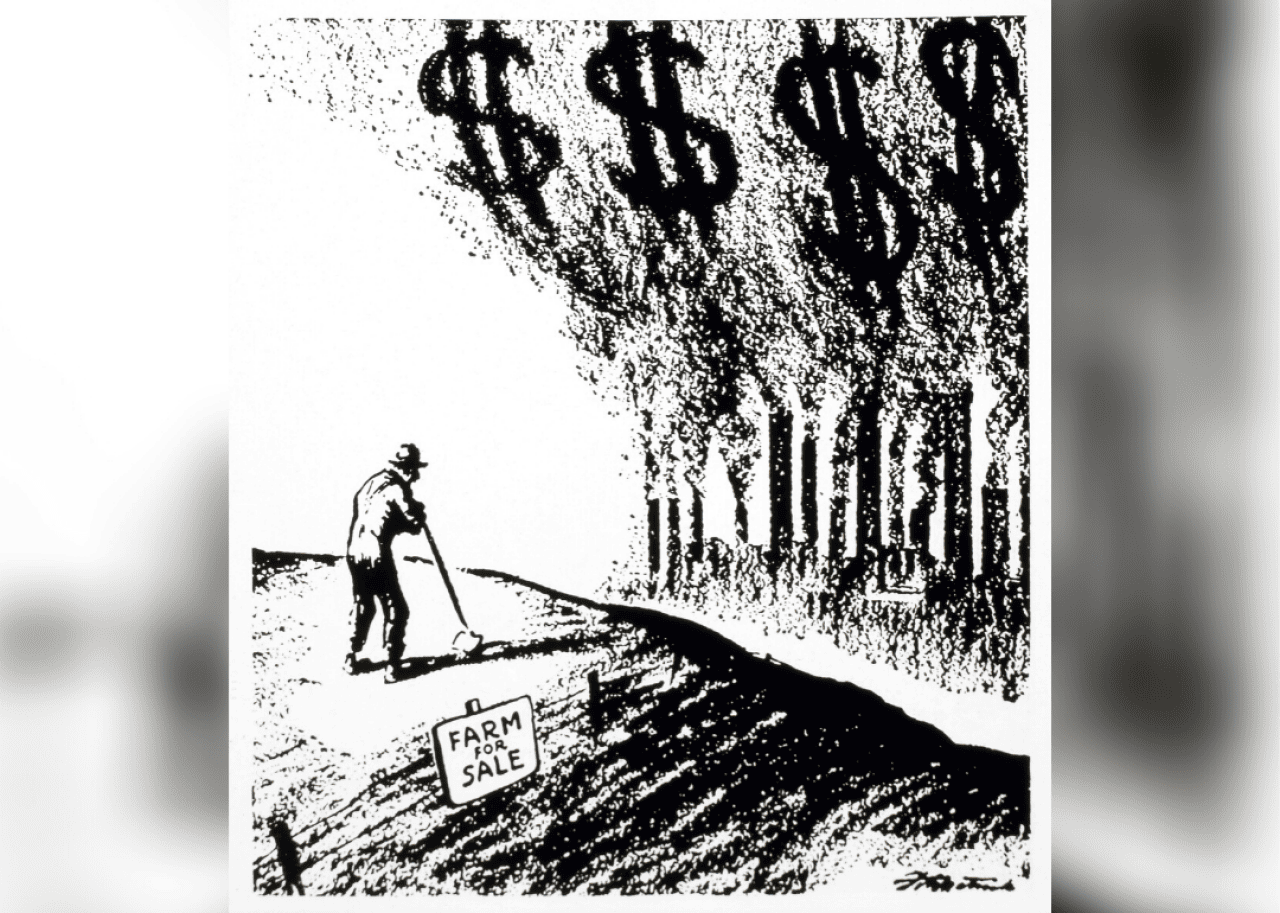 This cartoon shows dollar signs burning down a farm for sale, as a helpless farmer looks on. The cartoon illustrated the fall in farm prices during these years and the struggles farmers faced.