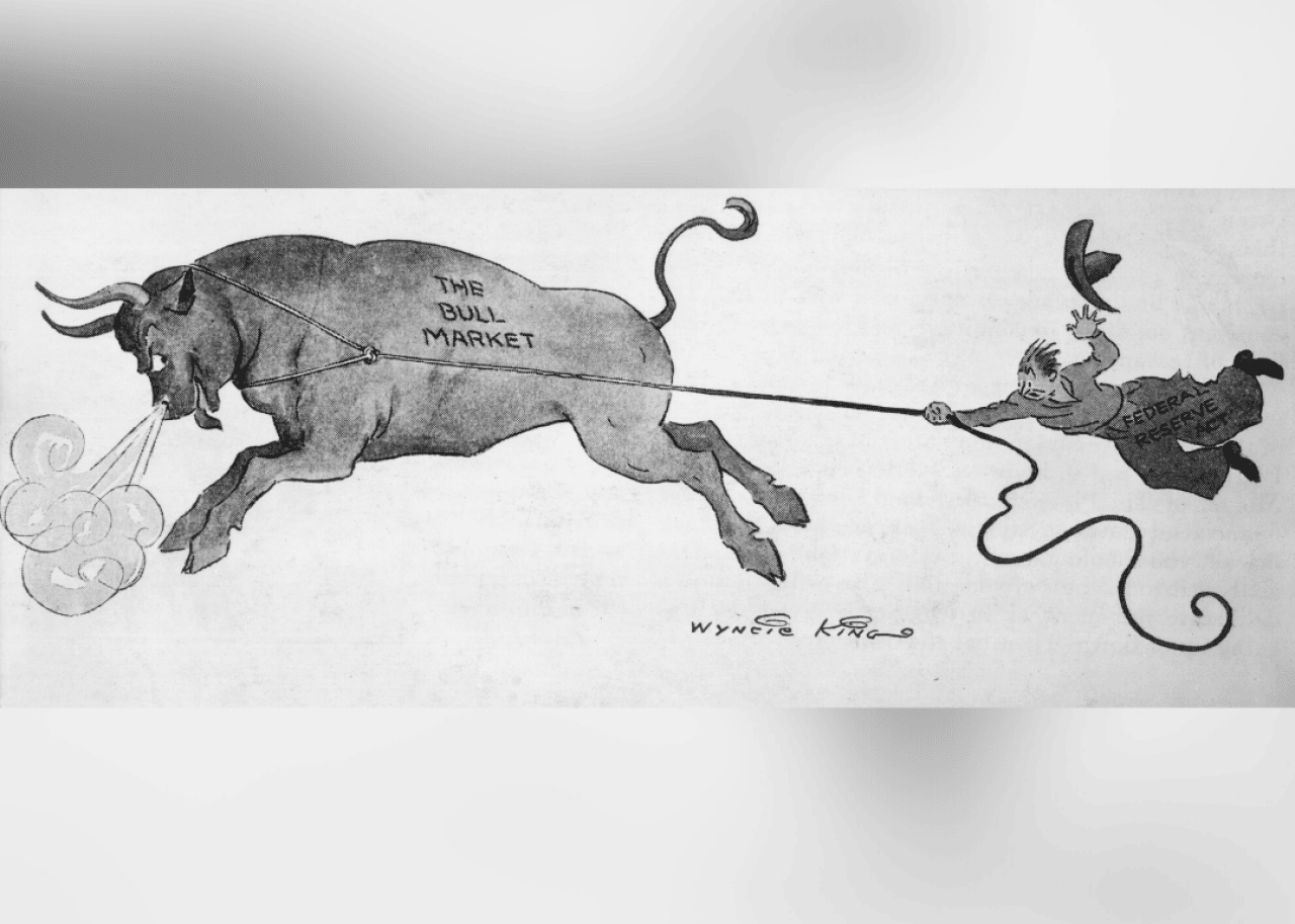 Winnie King drew a raging bull pulling the Federal Reserve at a high speed, which will inevitably make it crash. “The Bull Market” cartoon referred to the speculative bubble that led to a boom in the 1920s until the crash in 1929.