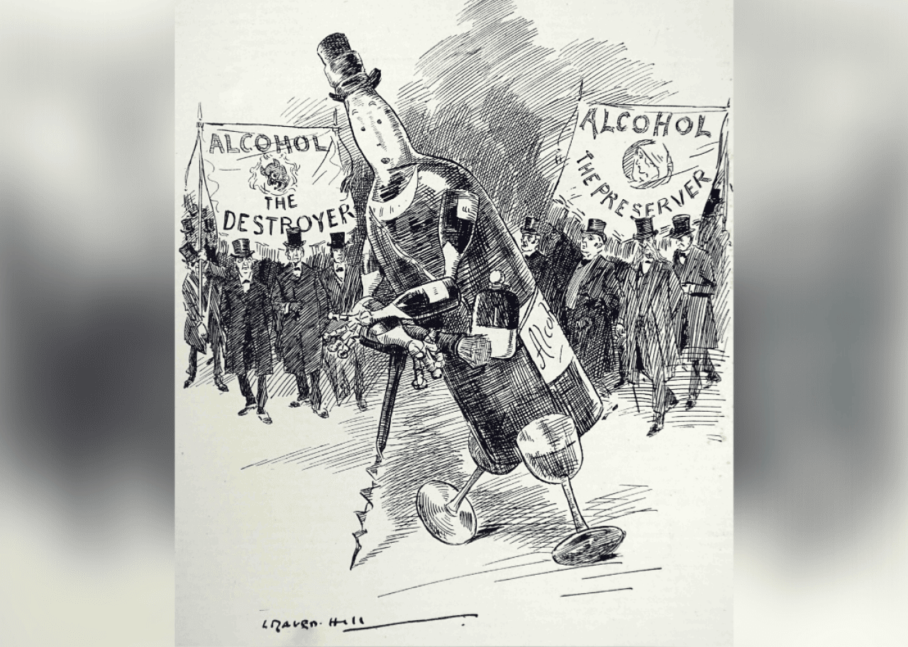 This Prohibition-era cartoon depicts a bottle being alternately vilified and defended by each side of the issue. The Temperance Movement proved to be a divisive era, with pro- and anti-alcohol citizens speaking out.