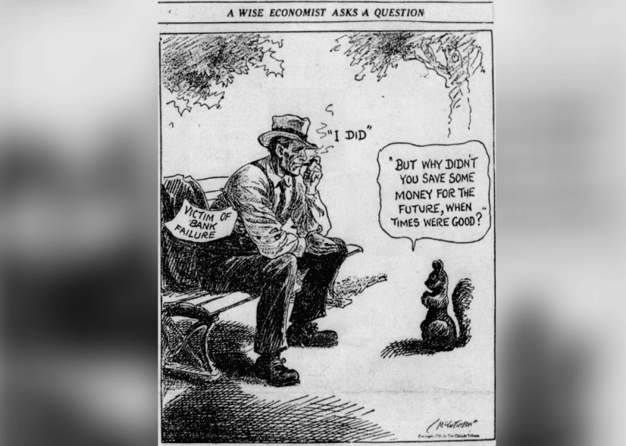In “A Wise Economist Asks a Question,” which won a Pulitzer in 1932, John T. McCutcheon describes bank failures during the Great Depression. The economist in this cartoon is a squirrel asking a new victim of bank failure if he had saved for a bad day.
