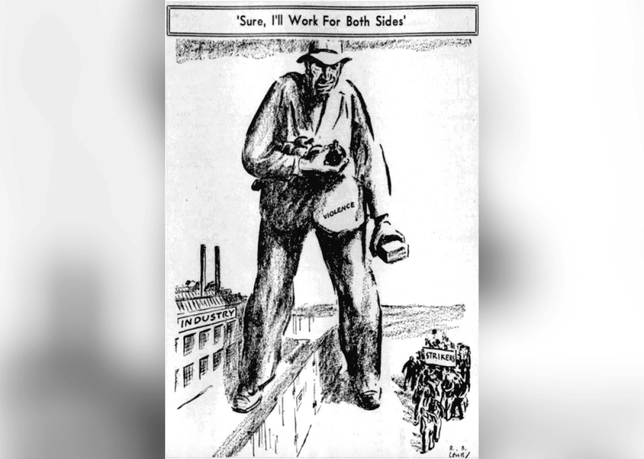 A wave of violent strikes broke out from Maine to Alabama in 1934. Ross A. Lewis painted a picture of violence on both sides: strikers and anti-unionists. In 1935, the cartoon won a Pulitzer Prize.