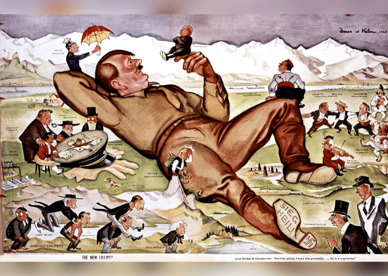 This cartoon shows a number of statesmen entertaining and comforting Adolf Hitler, who is reclining with a swastika on his shoe. The cartoon mocks the Munich Peace Agreement, which allowed Hitler to annex parts of Czechoslovakia.