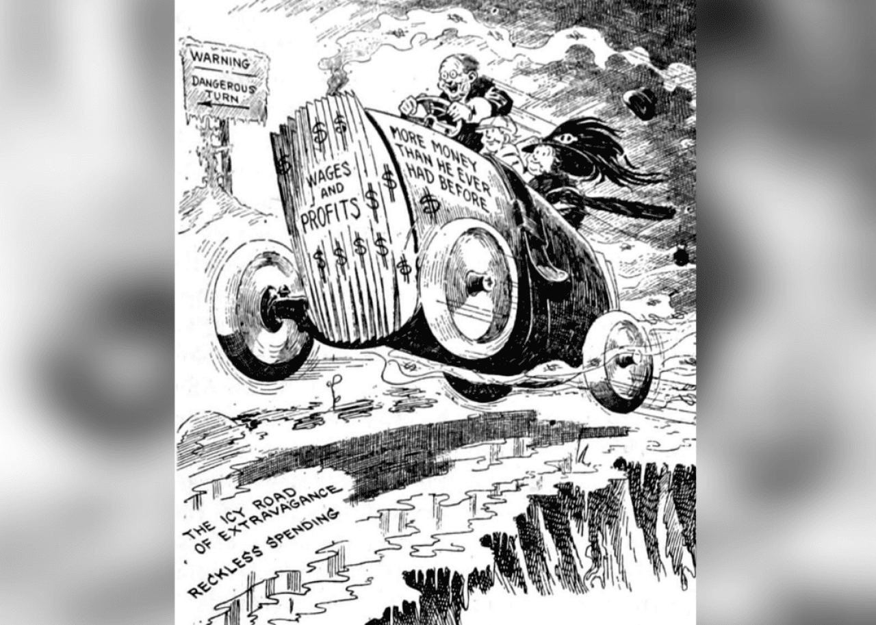 Americans in the 1920s spent money on expensive clothes and other ready-made items. Such extravagance was referred to as The Roaring Twenties. “Better Put on Chains” shows a speeding car with wages and profits on it. Ahead is a wrong turn, following an icy road of reckless spending.