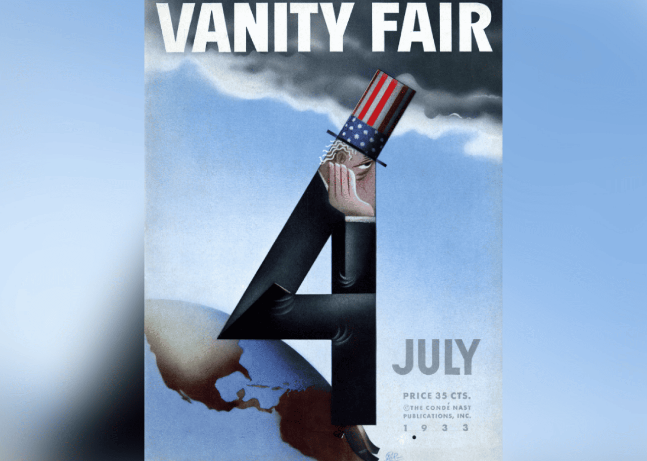 A frustrated Uncle Sam sits on a massive globe in “The Fourth of July’s Uncle Sam.” The cartoon was drawn by Paolo Garretto, who helped shape Vanity Fair’s refined style.