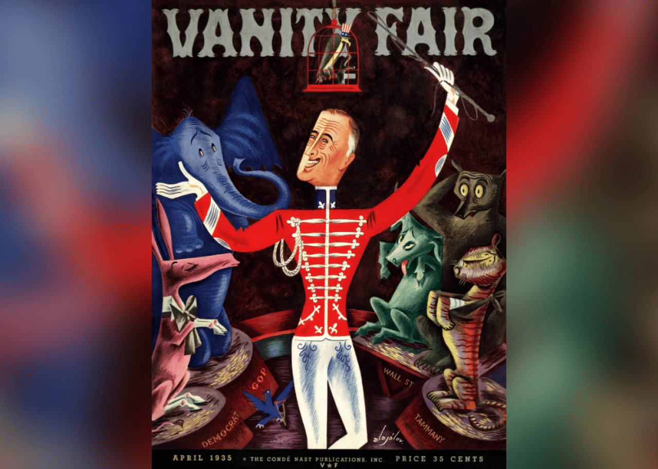 Constantin Alajalov drew President Roosevelt pulling the strings for circus animals. Each animal represents a different political faction following Roosevelt’s lead.