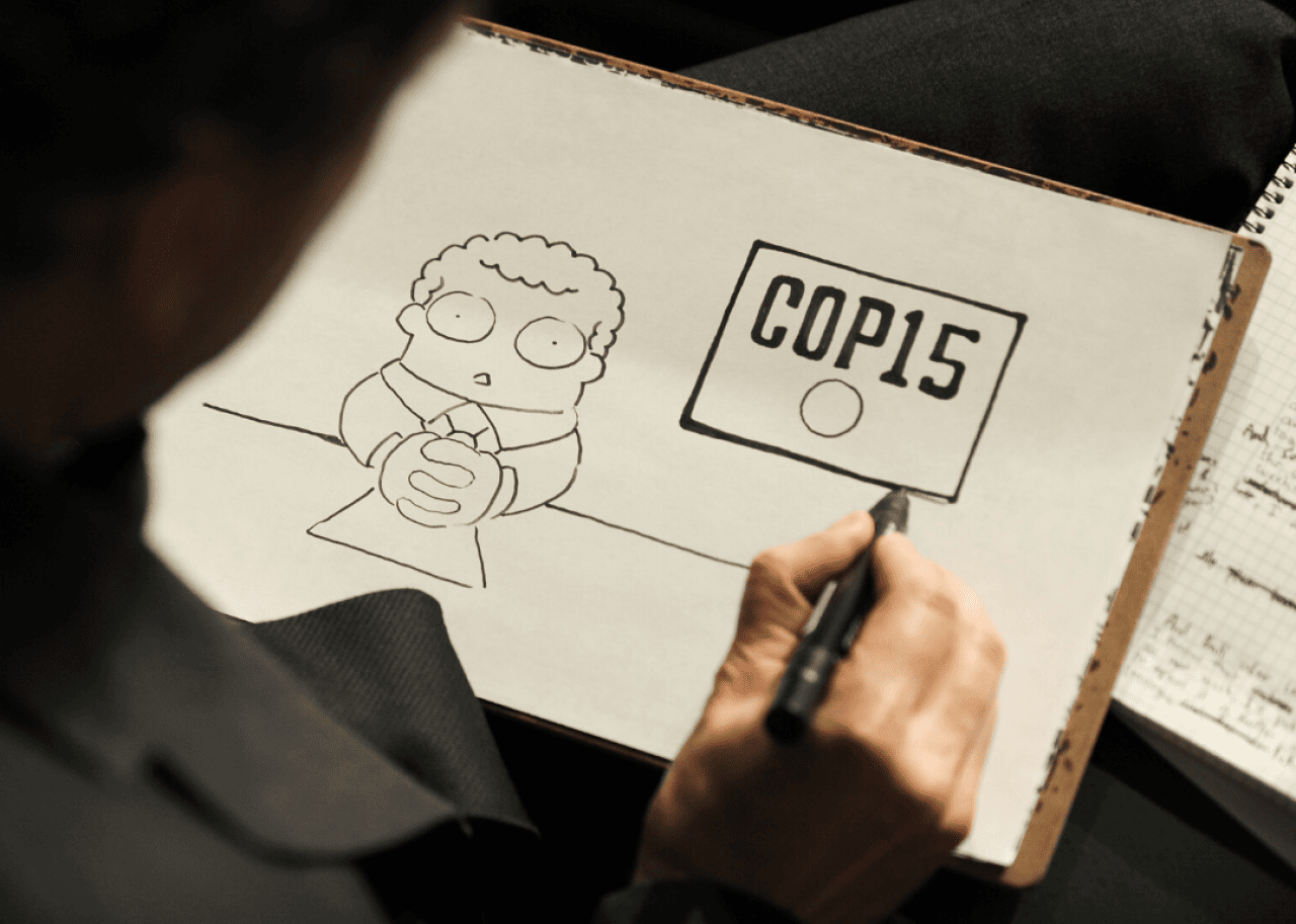 This photo shows an unknown journalist sketching a man waiting at a desk during the COP15 conference on biodiversity. The photo was taken at the Bella Center in Copenhagen, Denmark.