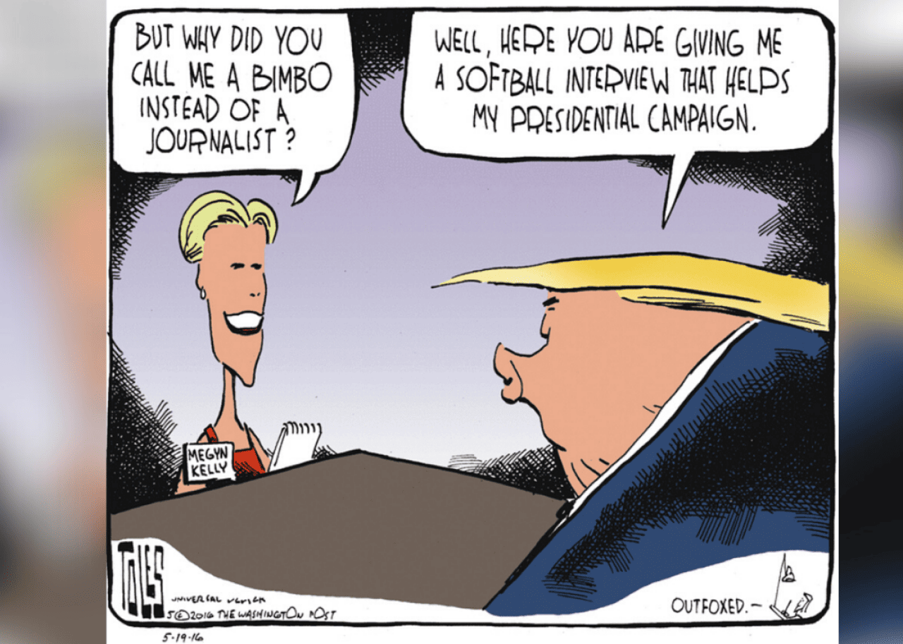 This cartoon depicts Fox News host Megyn Kelly interviewing President Donald Trump during the 2016 presidential campaign. Kelly asks Trump why he called her a derogatory name, to which he replies, “Well, here you are giving a softball interview that helps my campaign.” Trump and Kelly were involved in heated arguments during the 2016 presidential race.