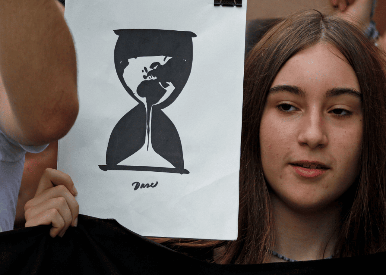 A climate change activist attends the Fridays for Future demonstration. She holds a placard featuring the planet depicted as sand within an hourglass, a strong suggestion that time is running out.