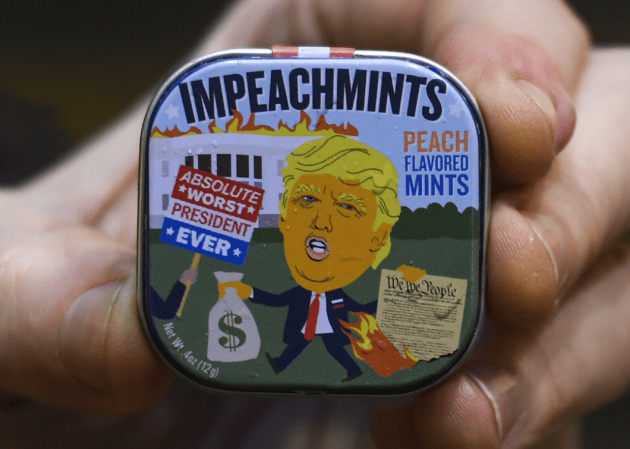 This box is a token given to Balla Ban Art Gallery clients in Dublin. The peach-flavored mints inside allude to the impeachment of President Donald Trump.