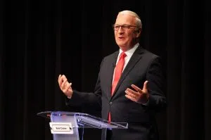 North Dakota U.S. Sen. Kevin Cramer speaks from the debate stage at Legacy High School in Bismarck on Oct. 16, 2024. (Michael Achterling/North Dakota Monitor)