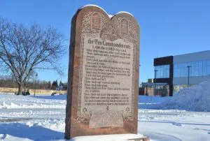 The Ten Commandments are displayed on a monument near the Civic Center in Fargo. (Jeff Beach/North Dakota Monitor)