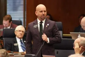 Rep. Scott Louser, R-Minot, speaks on the House floor on Feb. 25, 2025, about his property tax proposal. (Michael Achterling/North Dakota Monitor)