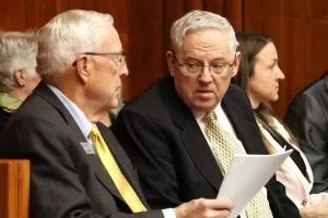 Commissioners Murray Sagsveen, left, and Ronald Goodman, right. (Michael Achterling/North Dakota Monitor)