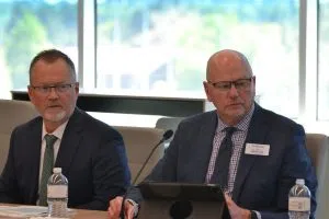 Tim Mihalick, right. Interim chancellor Brent Sanford. (Photo by Jeff Beach/North Dakota Monitor)