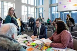 During his launch event speech, UND President Andrew Armacost traced the project back to his Wake Up to UND address last September, where “community” was introduced as UND’s Word of the Year. At the Wake Up to UND event, Armacost used the image of a quilt to visualize UND’s tightly knit community — a metaphor that inspired Honors Program director Mary Kirby and assistant professor of Music Whitney Mayo to approach him with this collaborative proposition.
