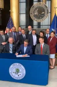 Burgum signed House Bill 1158 with Rep. Craig Headland, the bill’s prime sponsor, House Majority Leader Mike Lefor, Senate Majority Leader David Hogue, bill sponsors, Kroshus and other bill supporters during a ceremony at the Capitol.