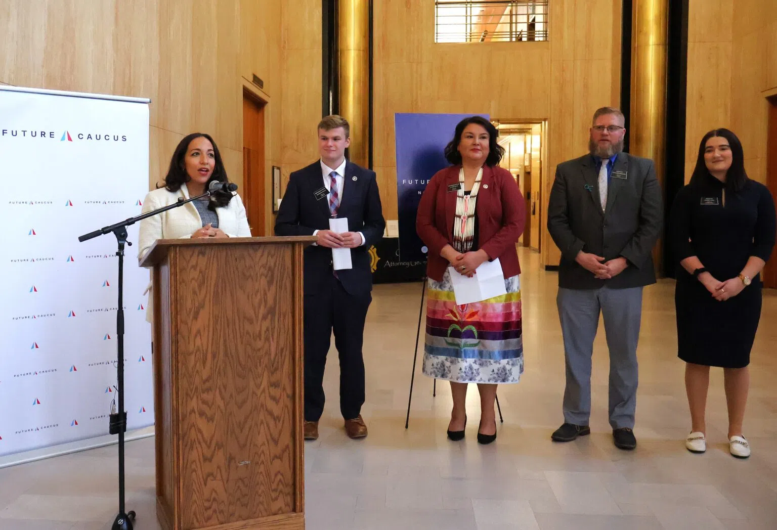 Layla Zidane, president of the Future Caucus. At podium. (Michael Achterling/North Dakota Monitor) (By: Michael Achterling. North Dakota Monitor) - Four North Dakota lawmakers announced ...