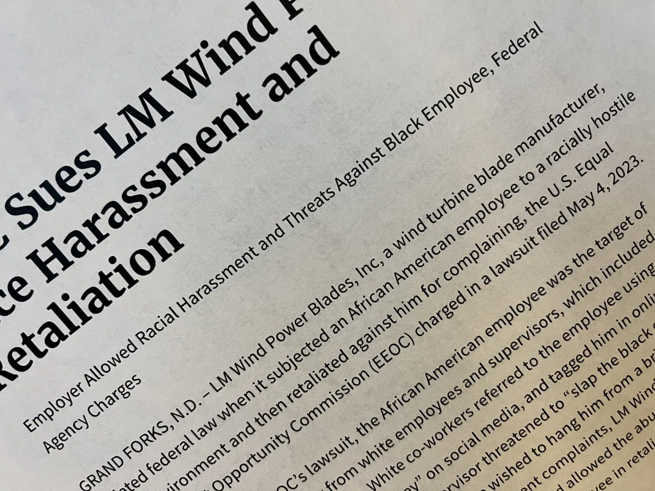 The U.S. Equal Employment Opportunity Commission has filed a complaint against LM Wind Power in Grand Forks for race harassment and retaliation. The lawsuit filed Thursday claims the wind turbine blad...