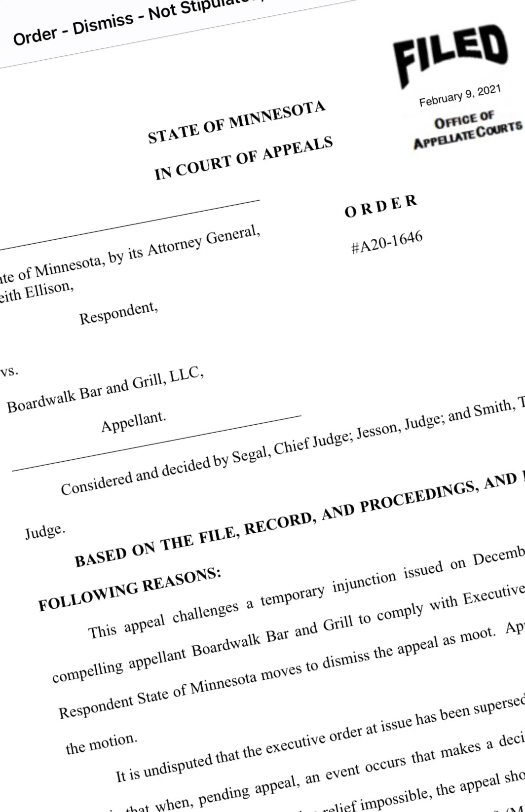 An appeal by the Boardwalk Bar and Grill challenging a temporary injunction over an executive order prohibiting dine-in services has been rejected by the Court of Appeals. The court ruled the December...